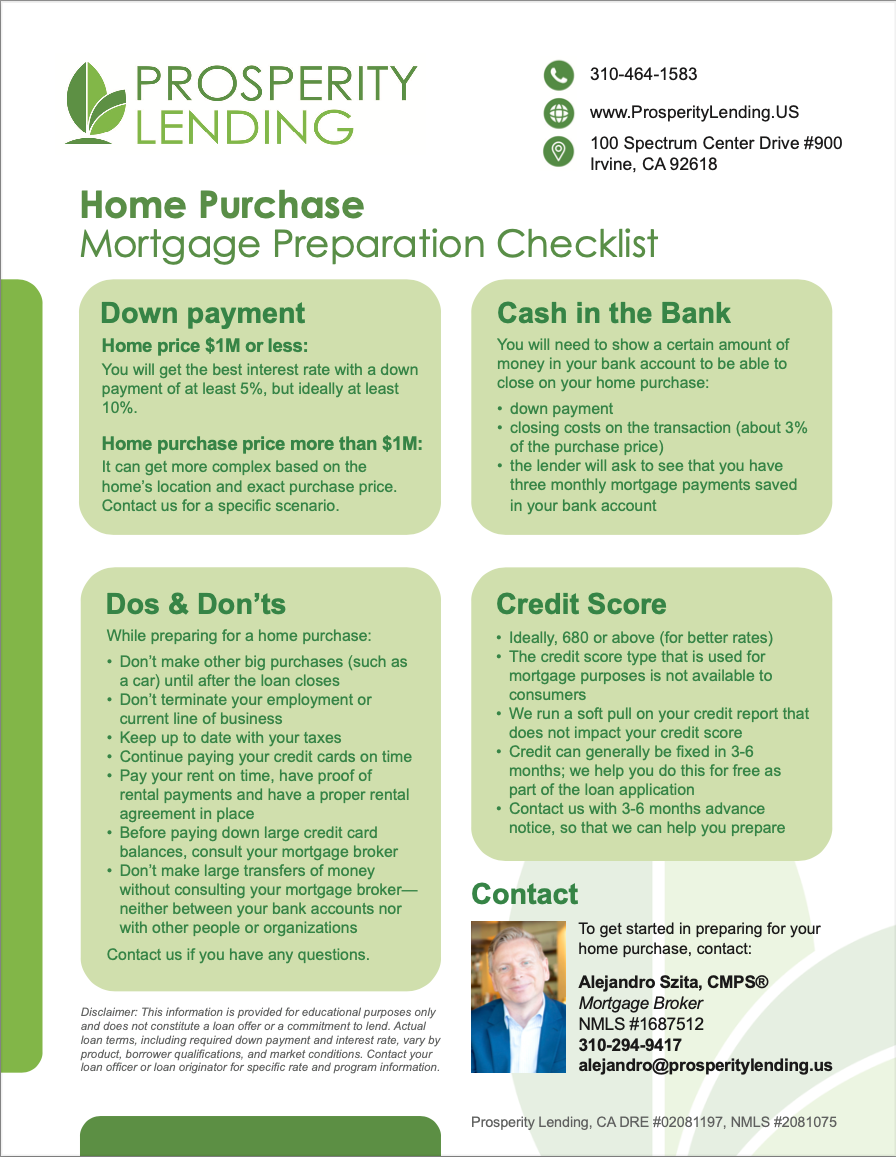 We made a very concise, one-page Mortgage Preparation checklist with all the most important points you need to keep in mind when getting ready for a mortgage application.