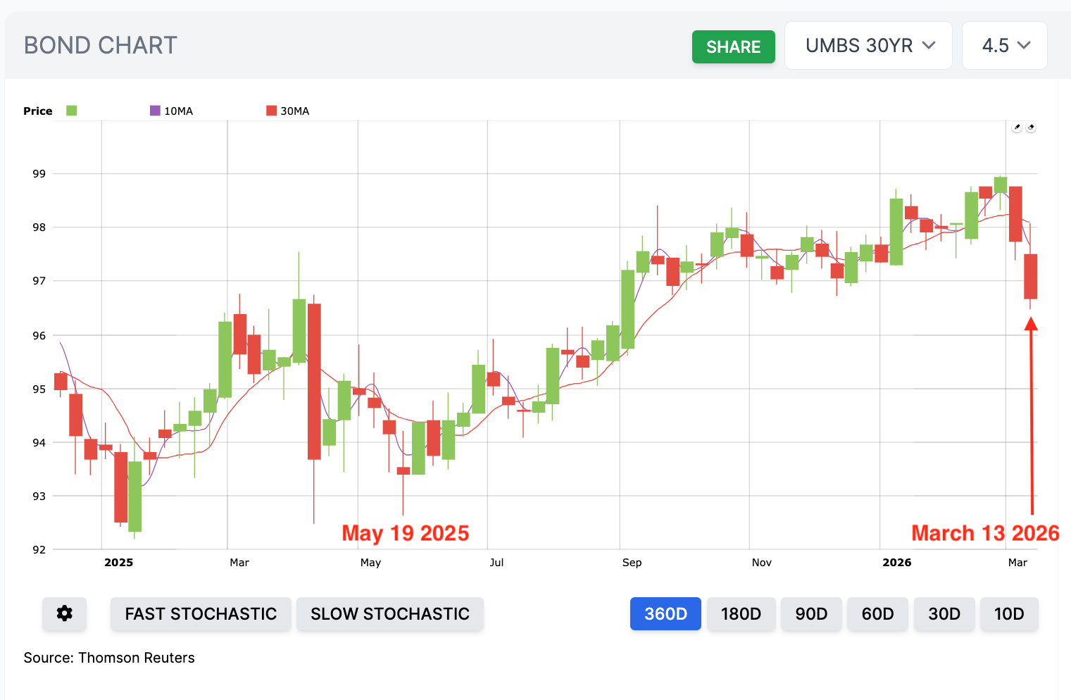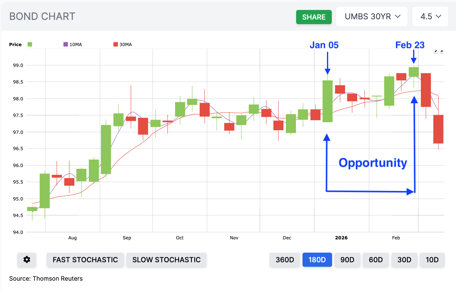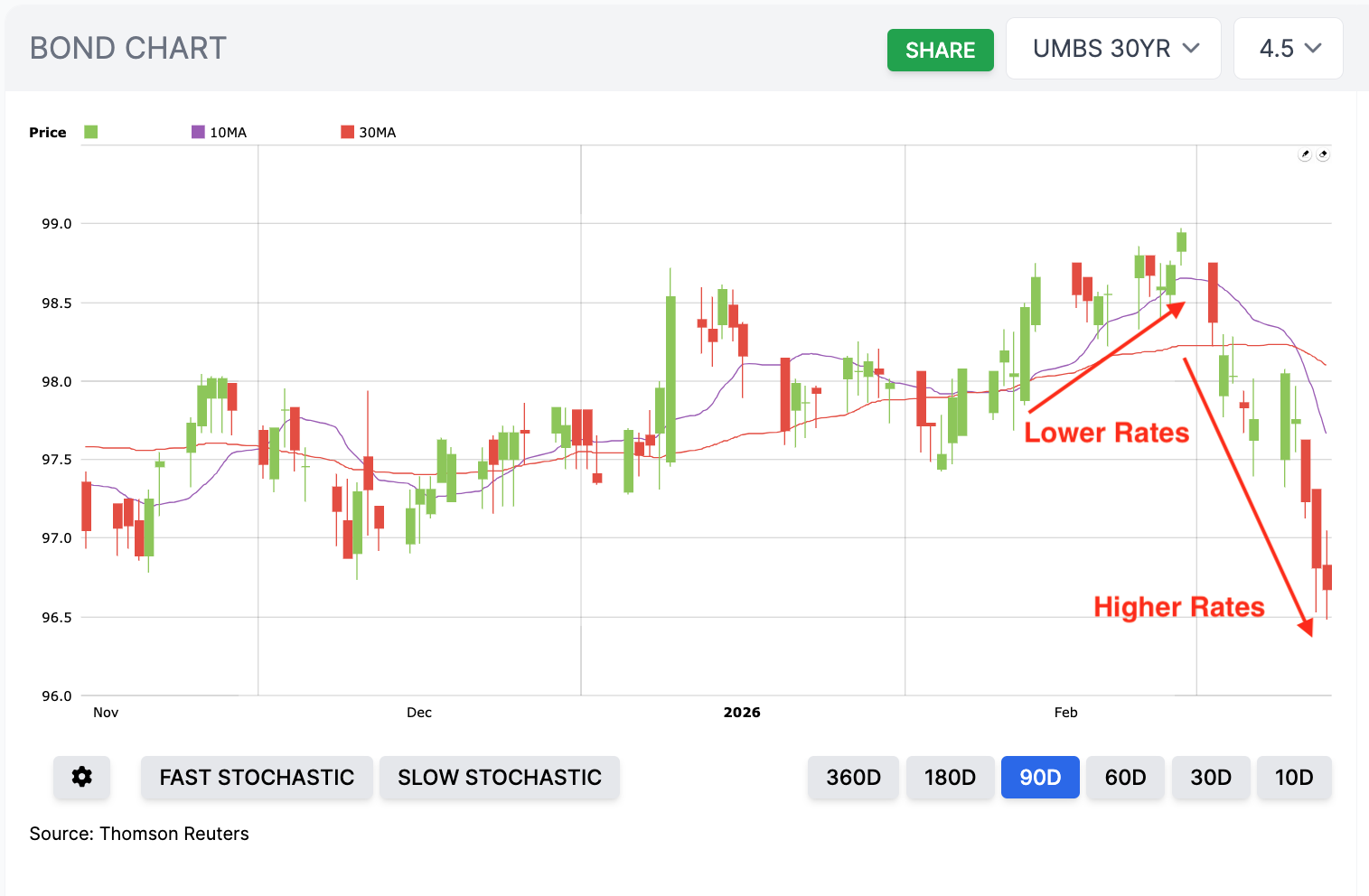 Quick Reminder: these graphs represent pricing for Mortgage Bonds. When bonds go up, rates go down. When bonds go down, rates go up. Bond pricing has an inverse relationship to Mortgage Rates.